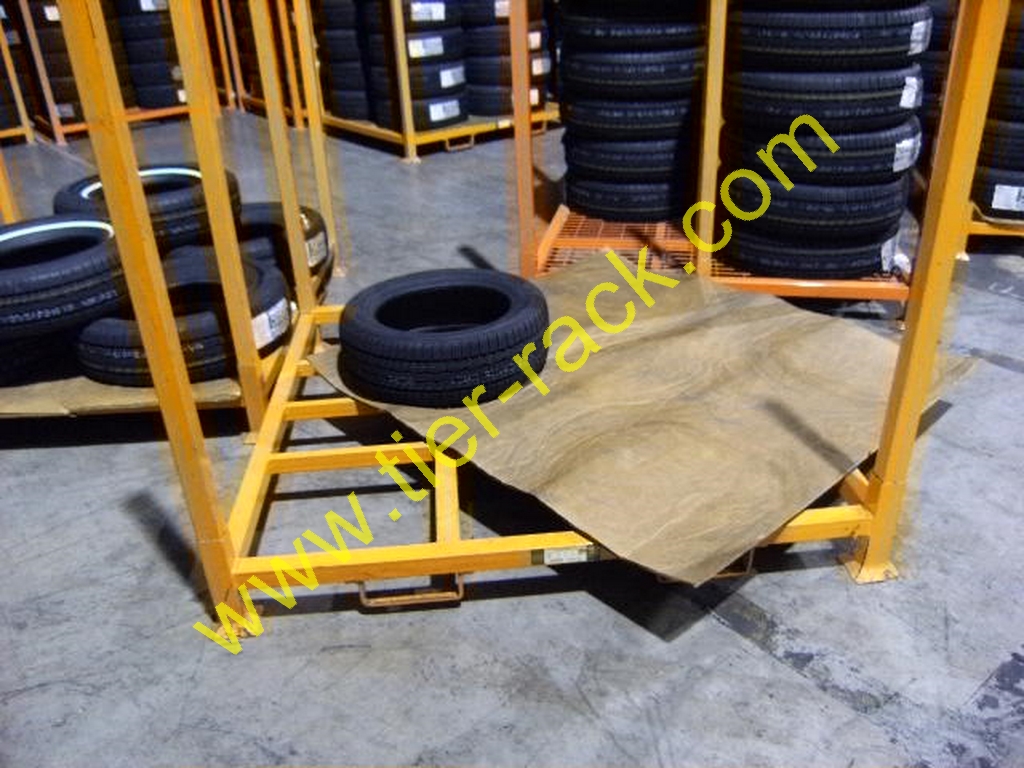 Another style of stacking rack uses wire mesh decking. This decking is less expensive than perforated metal decking and has larger openings in the deck. This is a good option if your tires are in and out of your warehouse rack frequently and the wire deck doesn't have time to leave marks on your product. Naturally, the least expensive portable stack rack for tires has no decking at all. The inner and outer rack beams are located so they support the tires. This works best if you do not have people standing on the rack as they load or unload the tires, since the rack beams do not provide as secure a work surface as a deck does.Used Tire Racks