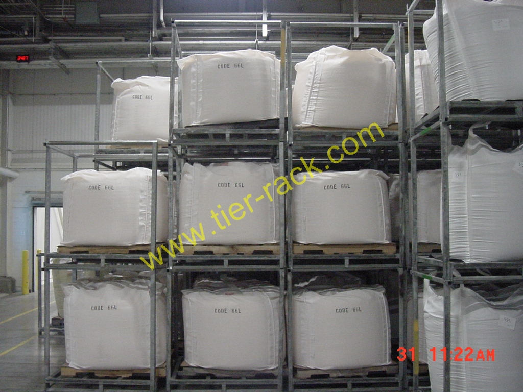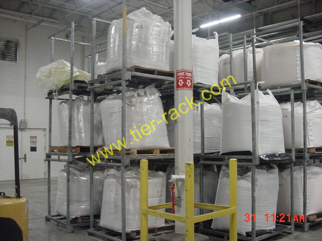The nesting rack plays the role of a movable rack that is nestable and facilitates bulk storage often used for bulk bag storage. Sometimes these racks are called a nestainer, jarke cupl-up, nestrack, nesting bin, nestable pallet, or nestable pallets. They can hold heavy loads (they are typically stacked in columns of 4 or 5 racks, with each rack holding 2,000 to 4,000 pounds). Empty racks and bins can be "nested" - one rack set inside another rack - up to 6 or 7 at a time. They are a storage system that saves time because the empty racks can be nested by one fork lift operator. A bundle of nested bins occupies less space than empty standard heavy duty pallet rack. The rear posts act as stops for your loads, so your fork lift operator does not have to guess how far into the nestable pallet the load should go. Many sizes and load capacities are available for Tier-Rack nesting racks.